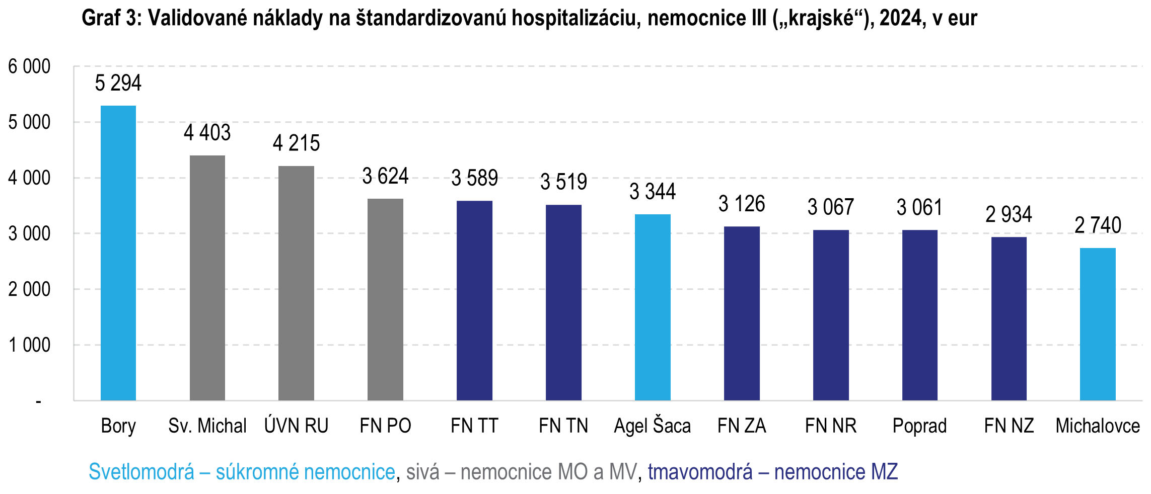 Zo skupiny nemocníc III („krajské“) tiež nevychádza jasný rozdiel v nákladovej efektívnosti medzi verejnými a súkromnými nemocnicami. Nemocnice Michalovce a Bory zo skupiny Penta[2] sú nákladovo najefektívnejšia a najmenej efektívna nemocnica. Ďalšia súkromná nemocnica Agel Šaca je nákladovo na úrovni fakultných nemocníc MZ. Vysoké náklady nemocnice Bory pravdepodobne súvisia s jej rozbehom – rok 2024 bol prvý kompletný rok fungovania nemocnice.